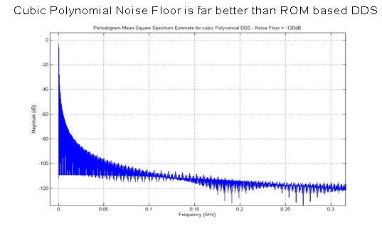 FIG. 6 is a periodogram obtained from the signal (W) at the output of the phase to amplitude converter or NCO. In one aspect, the periodogram indicates the primary signal output, along with the unwanted spurs and displays a noise floor associated with the cubic polynomial DDS 100 of FIGS. 1 and 6. FIG. 7 shows that, the noise floor associated with the DDS 100 is -120db which is much better than the ROM based DDS (having a noise floor of -76db to -90db). This is a significant improvement made in the proposed DDS 100. This occurs along with power savings (consumed by the ROMs in the conventional DDS). The low noise floor of the NCO allows a better sinusoid at the input of the DAC 102. This leads to a cleaner signal at the output of the DAC 102. This is turn leads to better signal at the mixer input and better mixer performance and better overall receiver performance (Fig 1).