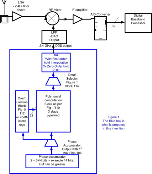 The DDS or NCO block is illustrated in Figure 1- it is a device designed to synthesize waveforms. It comprises of three sub blocks – the phase accumulator block which generates a digital phase word corresponding to a phase between 0 and 360o. The output of the phase accumulator block feeds a Polynomial Computation Block which is a 3 or 4 stage pipeline with only adders and multipliers and interstage registers.
