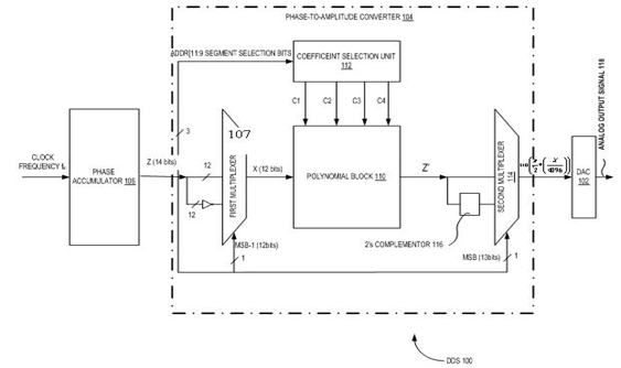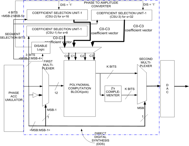 The first block is a multiplexer (Mux) that selects between the phase word and its binary complement. The COEFF registers are hard coded registers which are banked into three banks- CSU-1 (8 segments a total of 4×8 registers.). The second coefficient selection unit CSU-2 selects coefficients for 16 segments – a total of 16×8 registers.