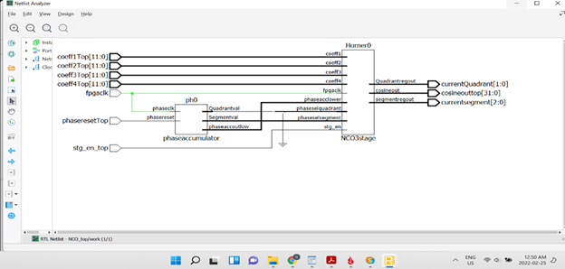 The last 9 bits are for fine increments of angle- 9 bits make a possible 512 samples within each sector. In this wave a full wave is split into 4 quadrants and each quadrant into further 8 sectors and each sector has 512 fine phase increments. Fig 2A and 2B in General Background explain this in detail. In example implementation in Fig 6 of the General background section shows 16K samples for a full cycle. Figure 2 shows the connectivity of various blocks of the NCO. There are 3 major blocks and 2 additional MUXes in Figure 2.