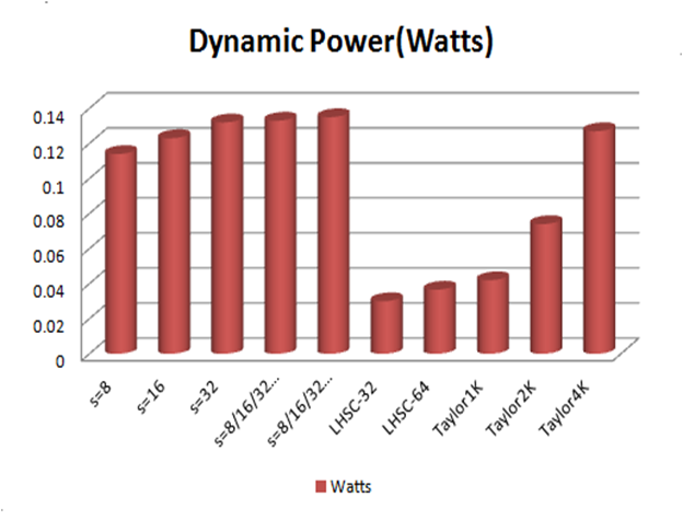 The power requirement values are plotted for various configurations of the DDS. The first column is for Cubic DDS with a 3-stage pipeline and s=8(8 segments/Quadrant). The second bar is for 16 segments / quadrant, the third bar is for 32 segments/quadrant. The next two bars are for a switchable DDS with variable number of segments and N= 512 or 1024. The last five bars are for non-Cubic DDS and outside the scope of this datasheet.