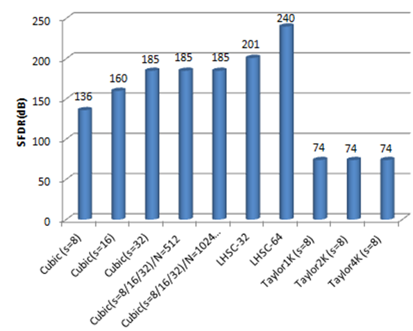 The first three curves are of interest here, they correspond to s=8/16/32 or rather segments / quadrant varying from 8 through 32. The next two bars are for switchable DDS and its clear the SFDR is only a function of segments/quadrant.