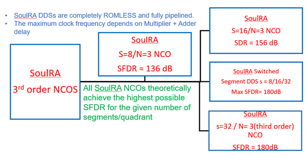 The current design of the NCO allows dynamic switching of SFDR and the LUT complexity between the lowest SFDR configuration to the highest SFDR configuration is under 10%. The NCO design can be scaled to the high SFDR of 180dB with higher number of segments but the resultant increase in LUT count is under 10%. There are no additional multipliers or adders required to increase the SFDR.