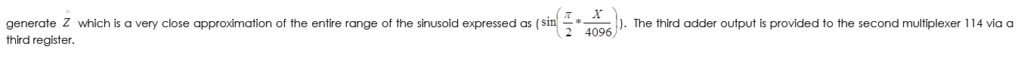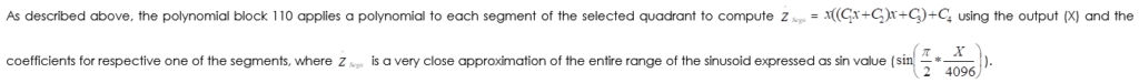 The core of the computation is performed by a 3-stage pipelined polynomial block (110). The polynomial block computes the output value for a given segment and given phase angle. It uses Horner’s rule to reduce the number of total multiplications from 6 to 3 multiplications per output sample. The critical path is reduced from (6Tm + 3Ta) to (Tm + Ta) which is a 8 fold reduction in the critical path. The details of the polynomial sub-block are given in the fig 3 of the General background section. The output of the polynomial block corresponds to a single half cycle.