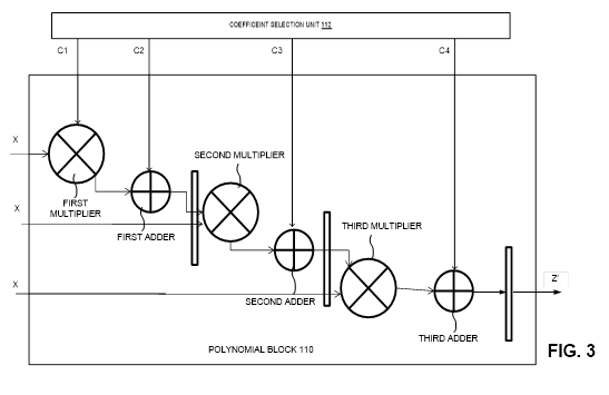 FIG. 4 illustrates a circuit diagram of the polynomial block. The polynomial block 110 includes a first multiplier, a first adder, a second multiplier, a second adder, a third multiplier, and a third adder. The first multiplier is coupled to the first adder, a first adder is coupled to the second multiplier. The second multiplier is coupled to the second adder. The second adder
