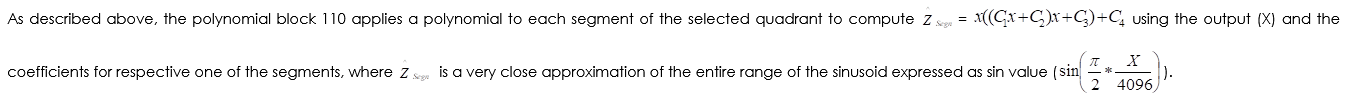 The fourth block stores 32 hard coded coefficients 4 for each quadrant of the sine wave (Coefficient selection unit no. 112). The bits [11:9] 3 bits are used to select one of 8 segments. The fourth block is a selection block which supplies the required coefficients for the cubic polynomial. The internal sub-blocks are discussed in Fig 4A in the General Background section.
